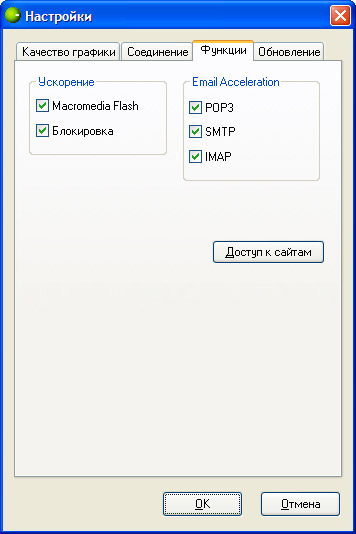 Вкладка Функции позволяет настроить сжатие сообщений электронной почты и роликов Flash. Путем экспериментов удалось установить, что чекбокс Блокировка отвечает за функцию блокирования рекламы. Здесь же, нажав на кнопку Доступ к сайтам, можно указать, к каким web-сайтам браузер будет обращаться напрямую, минуя OnSpeed.