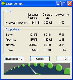 При знакомстве с интерфейсом программы, простым и понятным, вызывает чувство досады качество перевода программы, а также проблемы со шрифтами. С помощью верхнего пункта меню можно запустить/остановить сервис. Пункт Статистика открывает окно, в котором можно посмотреть, насколько были сжаты различные элементы web-страниц, а также общий коэффициент компрессии за время последней сессии.