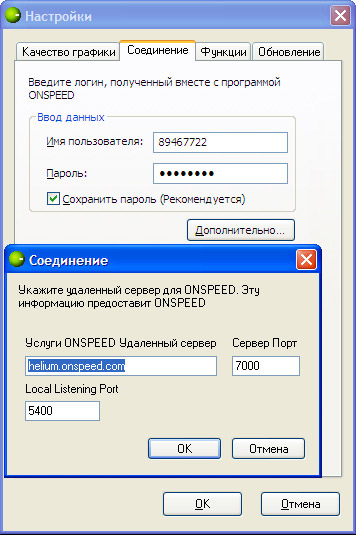 Вкладка Соединение позволяет произвести тонкую настройку взаимодействия браузера, клиентской части и сервера. Она используется при возникновении проблем, а служба поддержки OnSpeed обещает помочь разобраться в установках программы при появлении неполадок.