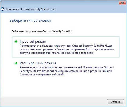 В состав линейки защитного ПО Outpost 7 от Agnitum входят три продукта: персональный файрволл Outpost Firewall Pro 7, антивирус Outpost Antivirus Pro 7 и комплексное решение класса Internet Security — Outpost Security Suite Pro 7. «Семерка» в версии обозначает выпуск нового поколения решения — предыдущее два года выпускалось под цифрой «6». Отстраняя в сторону все маркетинговые идеи, стоит отметить, что разработчик своевременно обновил свои приложения для соответствия современным требованиям к функциональности и внешнему виду программного обеспечения в контексте набирающей все большую популярность ОС Windows 7. Работа инсталлятора в новой версии приложения значительно упростилась — пользователь за несколько кликов переходит уже к самой установке, у него не вызывают вопросы некоторые запросы или формулировки на экранах. Так, например, классический переключатель режимов работы (обычный или расширенный") вынесен на отдельный экран в самом начале инсталляции.