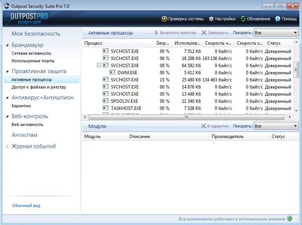 Выбрав пункт «Брандмауэр», можно увидеть статистику сетевой активности (количество переданных/полученных данных, программы, использующие в данный момент доступ в интернет, список атак, открытые порты со статистикой по каждому из них). Сетевой экран работает в шести режимах — от полной блокировки всего трафика до полного разрешения всей сетевой активности, по умолчанию он выставлен в режим обучения (то есть, правила будут создаваться по необходимости, если они не существовали ранее). В параметрах сетевого экрана пользователь может включать и отключать глобальные и низкоуровневые правила, указывать, для каких портов и против каких распространенных типов атак должна применяться защита файрволла. Здесь же можно задать список сайтов для блокировки по IP-адресу. Как сообщает разработчик, улучшения в модуле «Брандмауэр» значительно снизили нагрузку на процессор и сетевые подключения, в том числе при использовании P2P-соединений. Новый механизм фильтрации сетевых событий, отказ от фильтрации бинарных потоков, тонкая настройка пакетного снифера — эти и другие изменения позволили минимизировать влияние Outpost 7 на производительность системы.