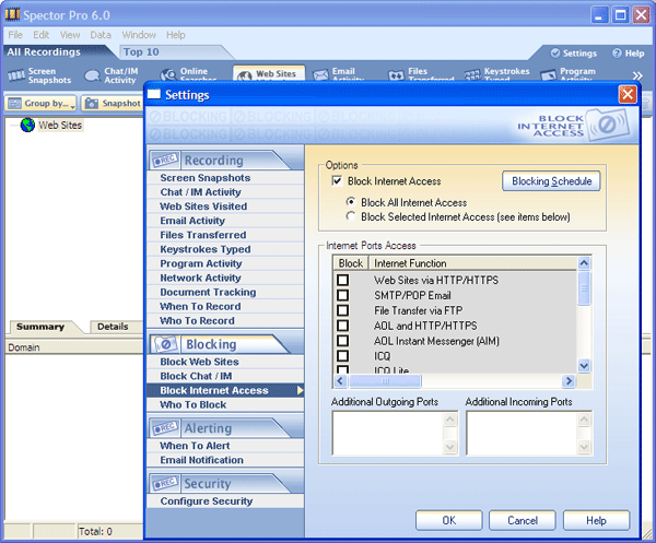 Блокировка передачи файлов осуществляется с помощью прослушивания протоколов FTP, Gnutella и HTTP. Программа может запоминать последовательности нажатий клавиш и сохранять их в журнале. Spector Pro также запоминает имена всех запускаемых приложений. Отдельной группой выделен контроль над сетевой активностью. Запоминаются приложения, которые ее вызывают, а также IP-адреса и порты. И, наконец, запоминаются имена всех открываемых документов, их печать, запись на оптические носители.