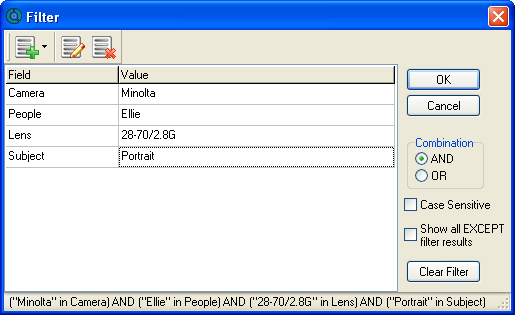 Другой, более сложный метод поиска заключается в создании сложного фильтра, состоящего из нескольких условий. Кнопка добавления новой строки вызывает меню, состоящее из четырех групп. В нем собраны все доступные типы меток. Вы выбираете одну из них, после чего вводите ее значение. После окончания ввода всех меток остается лишь указать правило вхождения строк. Поиск может считаться успешным в том случае, если фотография удовлетворяет сразу всем критериям или хотя бы одному из них.