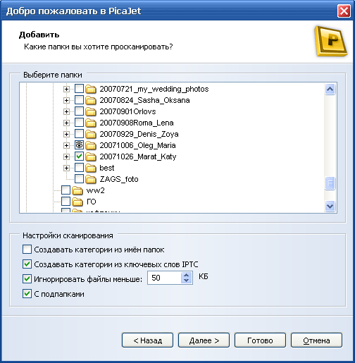 Программа позволяет систематизировать фотографии с помощью пользовательских категорий. Для упрощения первоначальной настройки вы можете создавать их из имен папок. Чаще всего каталогам даются довольно осмысленные имена, и даже если полученная структура категорий будет далека от идеала, это все равно лучше, чем ее полное отсутствие. Второй вариант означивания категорий заключается в извлечении ключевых слов IPTC. Вы можете также игнорировать файлы, имеющие объем, меньше указанного в настройках значения. По-умолчанию оно равняется 50КБ. Вряд ли фотографии, имеющие меньший размер файла, имеют высокую художественную ценность. Скорее всего, это какой-нибудь мусор в виде миниатюр или сильно сжатых копий уже существующих изображений. Сканирование папок может происходить с включением всех вложенных каталогов.