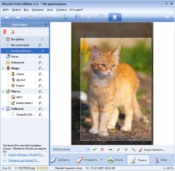 Перед отправкой изображения на мобильный телефон можно выделить на фотографии отдельный регион. Автоматически произойдет кадрирование и изменение размеров фото в зависимости от указания высоты и ширины экрана. Поддерживается поворот картинки на 90 градусов в обоих направлениях. Окно просмотра изображения масштабируется. Стоит напомнить, что только PiсaJet FX обладает возможностью отправки картинок на мобильный телефон. Бесплатная версия менеджера изображений, имея все вышеперечисленные опции, не позволяет осуществить непосредственную пересылку фотографии.