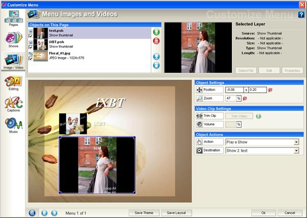 Разработчики ProShow Producer поступили мудро. Основное диалоговое окно не содержит инструментов ручной корректировки меню. Вы не можете перемещать его элементы в произвольные места, масштабировать и выполнять прочие операции, что присутствуют в алогичных программах. И это, на самом деле, отлично. Вместо ручных опций, вы можете выбирать оформление из огромного числа стилей, отсортированных по тематикам. Кроме того, вы можете выбрать раскладку меню и кнопок. Вариантов выбора также множество. Вот, фактически, и все. Начинающий пользователь, которому не нужны более сложные методы работы над меню, может быть, даже не заметит кнопки Customize, которая открывает полноценный редактор меню DVD-диска.