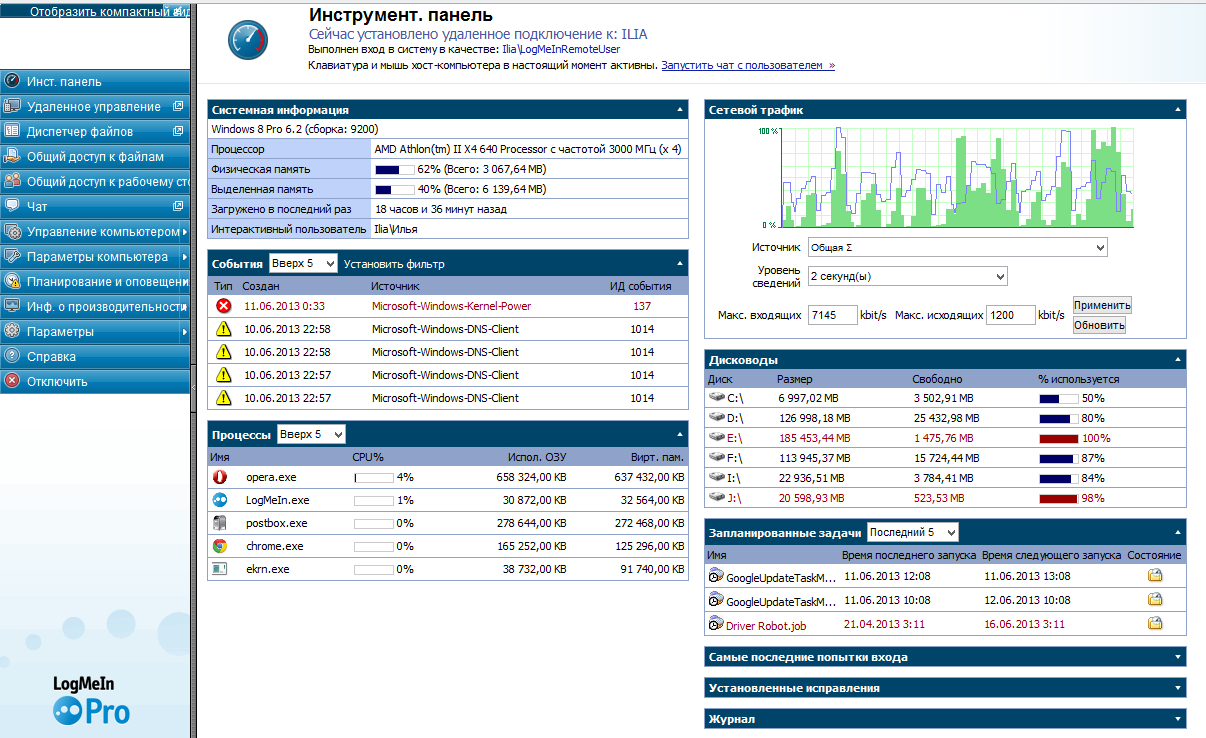 Достаточно гибкий и мобильный инструментарий для удаленного управления, с обширным перечнем возможностей, подробной документацией. Поддерживаются функции презентационные и внутренней коммуникации. Как результат, LogMeIn можно использовать как для удаленного контроля, так и для мониторинга, администрирования сети.
