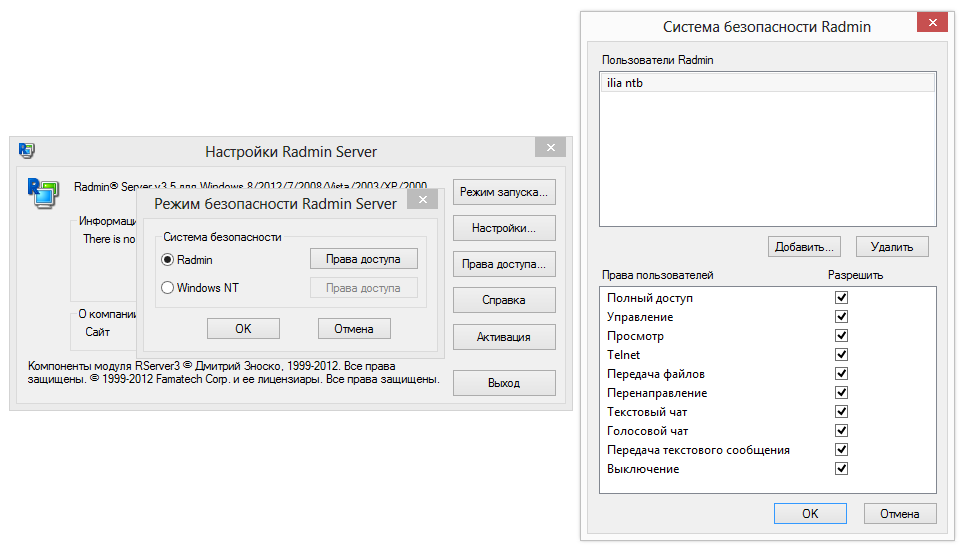 Клиент Radmin примечателен тем, что при настройке предлагает выбрать метод установки прав доступа – Radmin или Windows NT. Различие заключается в следующем: первый режим оптимален для соединения по Интернету, а методы Windows более оправданы для корпоративных сетей. Вдобавок, права доступа Radmin удобны своей выборочной настройкой доступа к важным функциям, плюс, можно составить список доверенных пользователей.