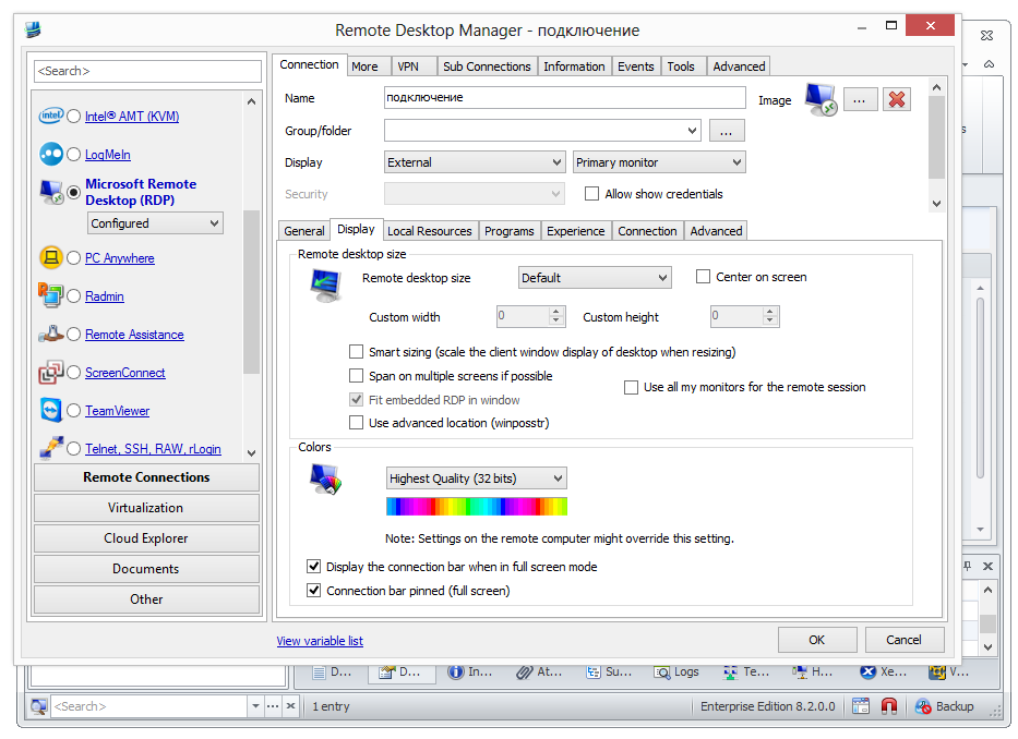 Remote Desktop Manager, с первого же взгляда, производит впечатление «универсала», объединившего в себе множество протоколов: RDP, SSH, Web, VNC, Telnet, ICA/HDX, TeamViewer, LogMeIn, FTP, нескольких типов VPS-соединений и мн. др. Централизация (термин, часто применяемый в описании RDM) относится и к другим аспектам — например, программа подходит для хранения конфиденциальной информации и других важных данных. Далее внимание будет обращено непосредственно на возможности удаленного контроля.