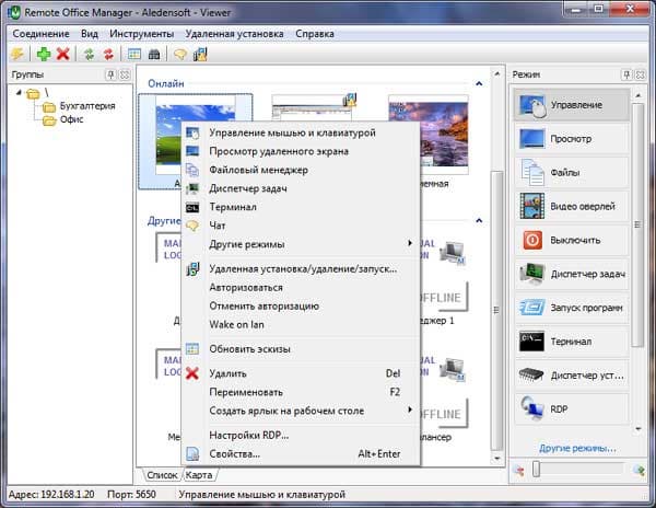 Режим удаленного управления рабочим столом компьютера является наиболее востребованным, он позволяет управлять работать с рабочим столом удаленного компьютера с помощью мышки и клавиатуры.