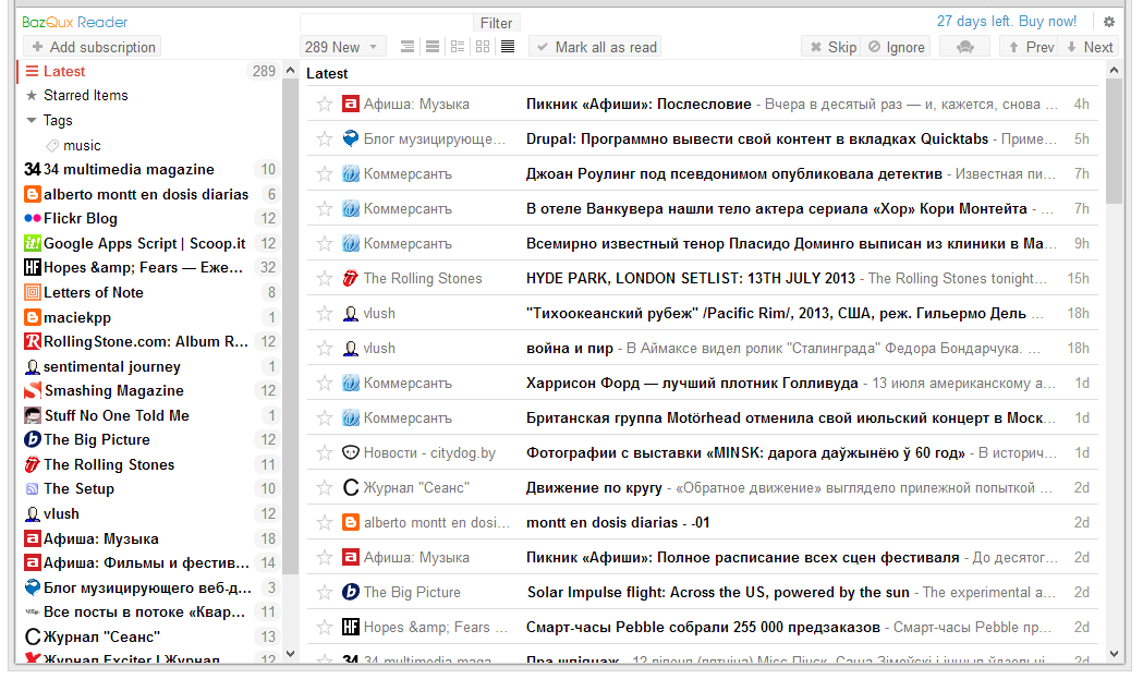 Что немаловажно, загрузка и обновление RSS-лент происходят быстро, нет замедлений или ошибок при выводе содержания. Как уже упоминалось, в Bazqux можно просматривать комментарии, а также отслеживать обновления в дискуссии. Любой материал предварительно форматируется через сервис Readability. Увы, вывод материала не всегда стабилен. Социальные функции также представлены в меню ленты: публикация ссылки по E-mail, в Twitter, Facebook, Google+, Tumblr или добавление в закладки Pinboard, Evernote, Instapaper или Pocket.