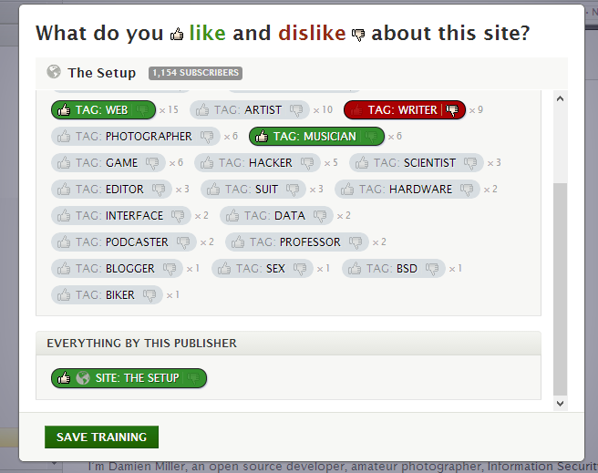 Есть в NewsBlur режим обучения (Intelligence Trainer), который помогает настроить вывод лент «по интересам». Обучение происходит следующим образом: при чтении пользователь указывает свое отношение к определенной статье, категории, где она находится, а также источнику (автору) материала. Оценка может быть негативной (dislike) или положительной (like). В дальнейшем NewsBlur посредством цветовых меток указывает пользователю, какой материал стоит прочесть, а какой — проигнорировать.