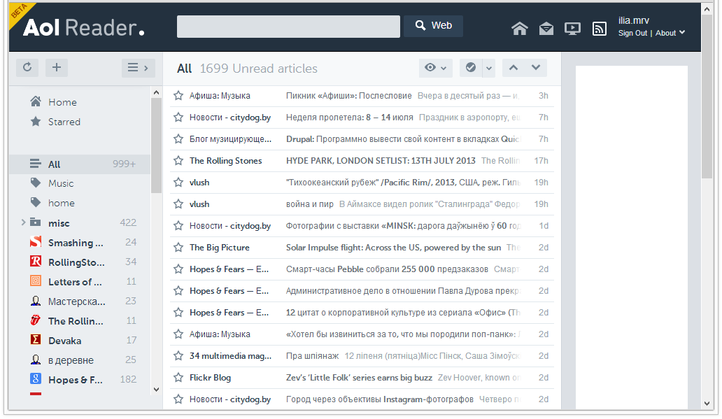 Войти на сервис несложно, авторизовавшись через Facebook, Twitter, Google+ или OpenID, минуя обычную регистрацию. Импортировав файл подписок Google Takeout, можно приступать к чтению: все ленты будут распределены в алфавитном порядке.