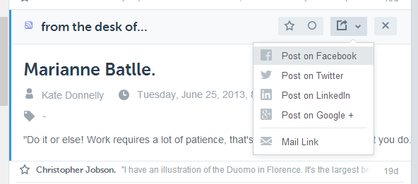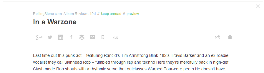 Рядом с Organize расположены разделы Today (чтение новостей текущего дня), а также Saved for Later (материалы для отложенного чтения). Обращает на себя внимание функциональная панель рядом с заголовком материала. Посредством ее возможна публикация ссылки в социальных сервисах (Google+, Facebook, Twitter и др.), добавление в закладки и для отложенного чтения (Evernote, Instapaper и др.), присвоение тегов и даже удаление новости из списка (команда, уникальная в своем роде).