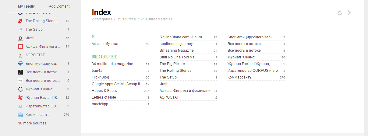 Порадовало стремление разработчиков внести собственные идеи в концепцию ридера. Например, есть раздел Index, где собраны все ленты в виде списка категорий и неотсортированных сайтов. Recently Read — история просмотренных лент, позволяет вспомнить забытое. Удобная возможность, особенно при отсутствии в Feedly поиска.