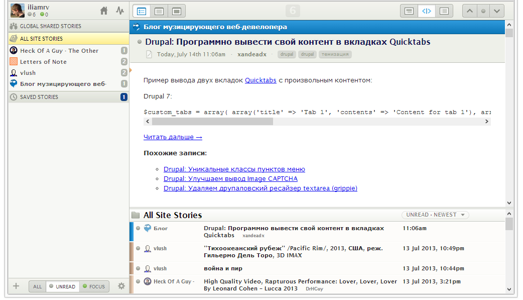 NewsBlur — функциональный RSS-ридер с удобной категоризацией, фильтрами, режимами отображения. Главным его достоинством можно назвать персонализацию: сервис настраивается под интересы читателя, позволяя быстро отследить наиболее важные обновления. Следственно, NewsBlur эффективен при работе с большим количеством RSS-лент.