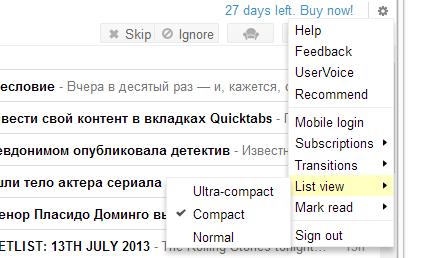 На выбор — 5 режимов чтения: расширенный, расширенный без комментариев, журнальный, мозаика и список. Список, он же List view, переключается между ультракомпактным, компактным и стандартным отображением.