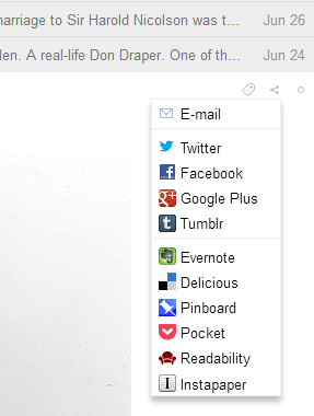 А вот пустота на панели инструментов бросается в глаза. Нет поиска, всего одна функциональная кнопка («Отметить все как прочитанное»), два режима чтения — список и разворот. Каждый материал можно сохранить в закладки, порекомендовать, поделиться в Twitter или Facebook, сохранить для отложенного чтения в Pocket, Readability, Instapaper.