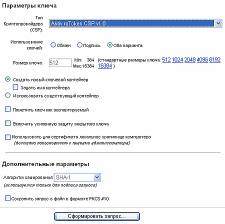 Выбрав вариант формирования запроса через браузер, вы попадете на страницу, где вам потребуется заполнить о себе некоторые данные (для тестовых целей они не критичны, и обязательными являются лишь два поля — имя и почтовый адрес). Далее — выбор параметров ключевой пары. Здесь вы должны выбрать из выпадающего списка криптопровайдер Aktiv Rutoken CSP v1.0 (можно взять и любой иной, но мы же тестируем токен). Затем выбрать вариант использования ключей — для обмена данными, для их подписи или для обоих вариантов (выбирайте последний). Далее — выбор размера ключа. Выбранный на предыдущем шаге криптопровайдер позволяет формировать ключи длиной от 512 до 16 384 байт. (Чем больше значение длины ключа, тем меньше вероятность взлома зашифрованных данных.)