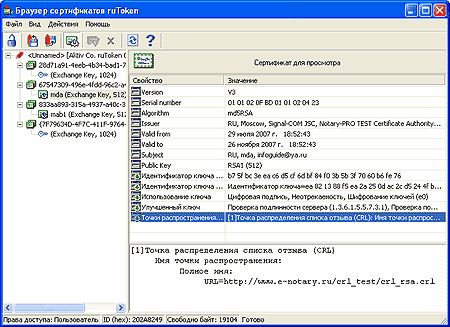 Из остальных опций рекомендую выбрать "Пометить ключ как экспортируемый". В этом случае после его установки вы сможете создать резервную копию пары ключей и сертификата и сохранить их в виде файла. Зачем? На случай утраты токена или его повреждения. Остальные опции можно не изменять и далее запустить процесс формирования запроса. После того как запрос будет обработан, вы сможете установить сертификат на компьютер. Обратите внимание на следующий момент. Давайте откроем браузер сертификатов (мы уже говорили, что он устанавливается вместе с драйверами). После того как вы сформируете запрос, на токене появится новый контейнер с парой ключей. В параметрах ключа будет указана его длина, область применения и значение открытого (публичного) ключа. После установки сертификата информация изменится. В контейнере будет уже не только ключ, но и сертификат со всем своими характеристиками: имя владельца, его почтовый адрес, иная информация, указанная вами при формировании запроса. Кроме того что сертификат будет помещен на токен, он также будет установлен в личное хранилище сертификатов, где его можно будет просмотреть через свойства браузера.