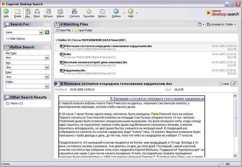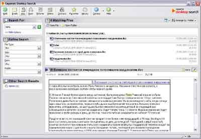 Отдельно стоит упомянуть про окно отображения результатов. Под списком найденных файлов отображается содержимое этих файлов (аналогичная схема часто используется в почтовых клиентах). Правда, просмотр текста можно осуществлять лишь в родном формате, а режима отображения plain текста нет, что не всегда удобно, так как открытие документа в этом случае занимает больше времени. Зато, учитывая, что Copernic умеет искать изображения и музыку, здесь есть возможность просмотра и этих мультимедийных файлов.