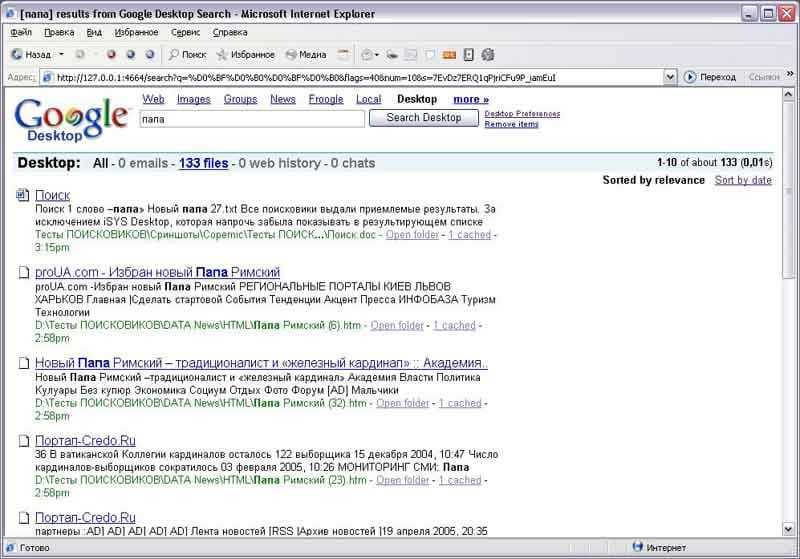 Что касается анализа поисковых запросов и выдачи результатов, то здесь все абсолютно идентично Google в Интернет: такая же система отображения результатов, тот же стандартный набор логических операций для поисковых запросов. В общем Google Desktop Search, как и предыдущая программа, предназначен исключительно для поиска файлов - внутреннего просмотрщика этих файлов в нем, разумеется, нет. Количества форматов файлов, поддерживаемых Google Desktop Search, вполне достаточно, а также приятно, что он осуществляет поиск по посещенным Интернет страницам, беря данные из кэша. Скорости поиска и индексирования вполне приемлемые. Правда, для домашнего использования. С внушительными 20 гигабайтами текстов Google Desktop Search справилась за 8 часов 17 минут. Потратить несколько дней на обработку информации из корпоративной сети крупного предприятия не улыбается ни одному сисадмину. Из плюсов: размер создаваемого индекса оказался на уровне (4,5 Гб) с другим поисковиком, протестированном в этом обзоре - SearchInform.
