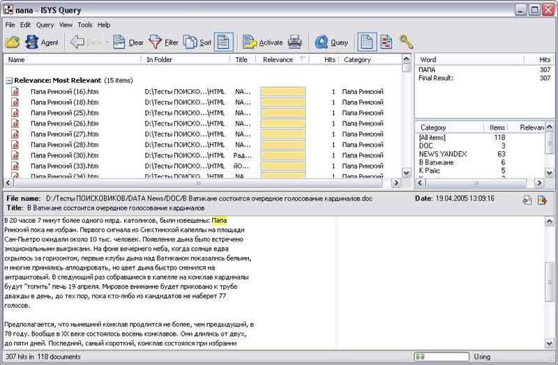 Результаты поиска весьма информативны, отображаются в виде списка документов, отсортированных по релевантности. Ниже отображается предпросмотр выбранного документа. В отличие от Copernic Desktop Search, предпросмотр здесь доступен лишь в виде plain текста, добиться отображения документов в родном формате, будь то Word, Html или PDF так и не удалось, хотя это в принципе и не слишком критично. Программа позволяет разбивать найденные документы на группы по определенным признакам (по умолчанию они разделены по релевантности). Можно также просматривать уже найденные документы, выбирая отдельные папки (это удобно, когда результат выдает очень большое количество документов).