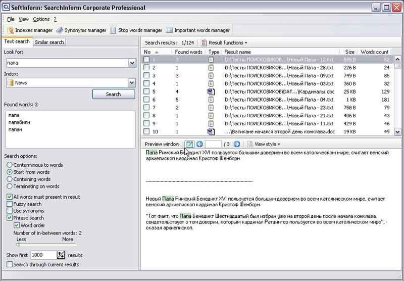 Что касается возможностей поиска, то здесь они на должном уровне. Во-первых, в dtSearch присутствует морфологический поиск (поиск слова во всех его морфологических формах). Используя данную возможность, вы освобождаете себя от, скажем, таких раздумий, как "в каком же падеже было употреблено некоторое слово в необходимом мне документе?". Использование морфологического поиска почти всегда оправдано, поэтому должно присутствовать в любом профессиональном поисковике.