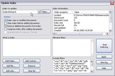 Что касается создания индексов, то программа предоставляет возможности по упрощению процесса установки опций для нового индекса. Эти возможности включают в себя несколько готовых шаблонов для создания индексов по папке "Мои документы", "Почта", "Почта и документы", "Определенная папка", "Папка с выбором типов файлов" и др. Такие шаблоны упрощают создание индексов на первом этапе. Утилита для работы с индексами обладает не слишком удачным интерфейсом, отпугивающим некоторой сложностью (это весьма субъективная оценка, по правде говоря), однако, если разобраться, он предоставляет множество полезных опций и в целом его использование особого труда не вызывает. ISYS Desktop умеет индексировать данные из различных источников данных, а также предоставляет множество гибких настроек для такой индексации. Среди дополнительных возможностей по индексированию: поддержка SQL, FTP, TRIM Context, WORLDOX 2002, скрипты. При создании индекса, если вы выбирали пункт "Папка с выбором типов файлов", у вас есть возможность выбрать типы файлов для индексации вручную (по расширению). Надо сказать, что поддерживаемых типов файлов просто огромное количество, однако свой тип (расширение) добавить в существующий список не удастся. Можно также отметить наличие планировщика индексации. Созданием индекса и обработкой 20 гигабайт информации ISYS Desktop занималась 6 часов 13 минут, в конечном итоге показав неплохое время и размер созданного файла - 7.9 Гб.