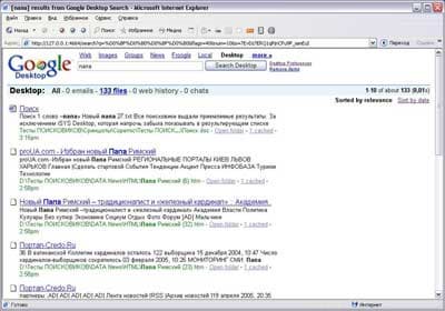 Первое, что бросается в глаза - отсутствие собственной оболочки для программы. Google Desktop Search по-прежнему находится в окне браузера, соответственно, весь интерфейс настольной версии достался софтине от старшего Интернет-брата. Хорошо это или плохо - спорный вопрос: кому-то по душе минимализм в дизайне этого поисковика, а кому-то хочется видеть полноценное приложение, наполненное всякого рода кнопочками и так далее.