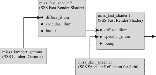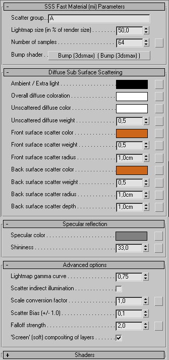 В качестве альтернативы можно декларировать собственный материал, создав интерфейс для настроечных параметров, аналогично тому, как это сделано для miss_fast_simple_phen и miss_fast_skin_phen. Это позволит сгруппировать в одном месте настроечные параметры, сделав удобным их редактирование. В качестве примера файл subsurface_mod.mi содержит SSS Fast Cascade Material, который аналогичен SSS Fast Skin, но позволяет каскадировать произвольное число misss_fast_shader, то есть определять произвольное число рассеивающих и зеркальных слоев.