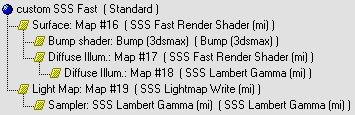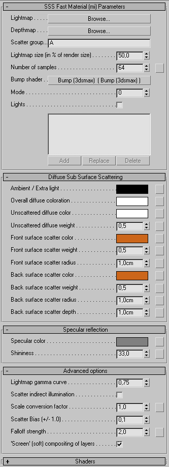 1. subsurface_mod.mi — отредактированный оригинальный subsurface.mi, в нем открыты все шейдеры и все их свойства, содержит исправленный материал miss_fast_simple_phen (SSS Fast Material) и нестандартный материал SSS Fast Cascade Material для каскадирования произвольного числа слоев. Для использования это файл нужно поместить в папку 3dsmax7mentalrayshaders_standardinclude и переименовать его в subsurface.mi, перед этим не забудьте сделать резервную копию оригинального subsurface.mi.