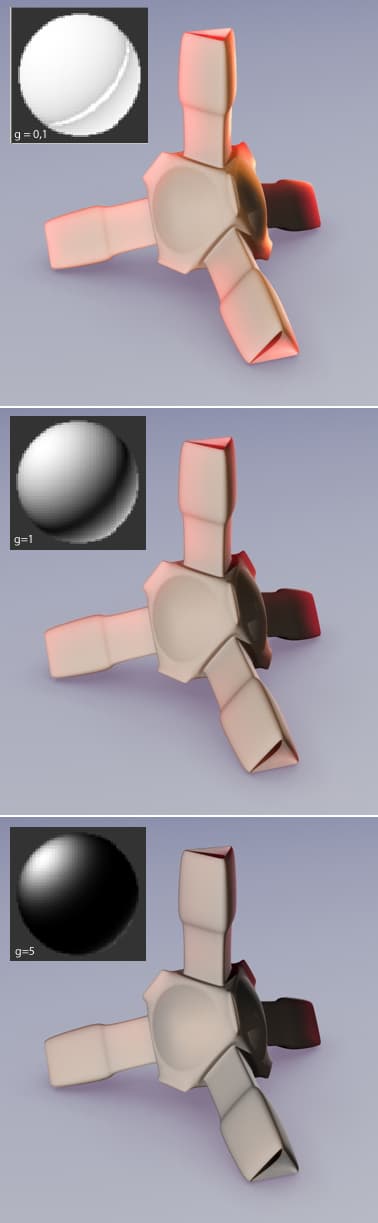 Данные о диффузной освещенности точек поверхности карты Lightmap рассчитываются по закону Ламберта. По умолчанию, этот расчет выполняется шейдером misss_lambert_gamma. Размер карты, то есть общее количество точек с посчитанной освещенностью, можно задавать в настройках. Когда луч от камеры достигает некоторой точки поверхности, ее освещенность от подповерхностного рассеяния рассчитывается сбором освещенностей соседних точек из lightmap с учетом затухания, определяемого заданным радиусом подповерхностного рассеяния. Количество просматриваемых соседних точек также можно изменять в настройках.