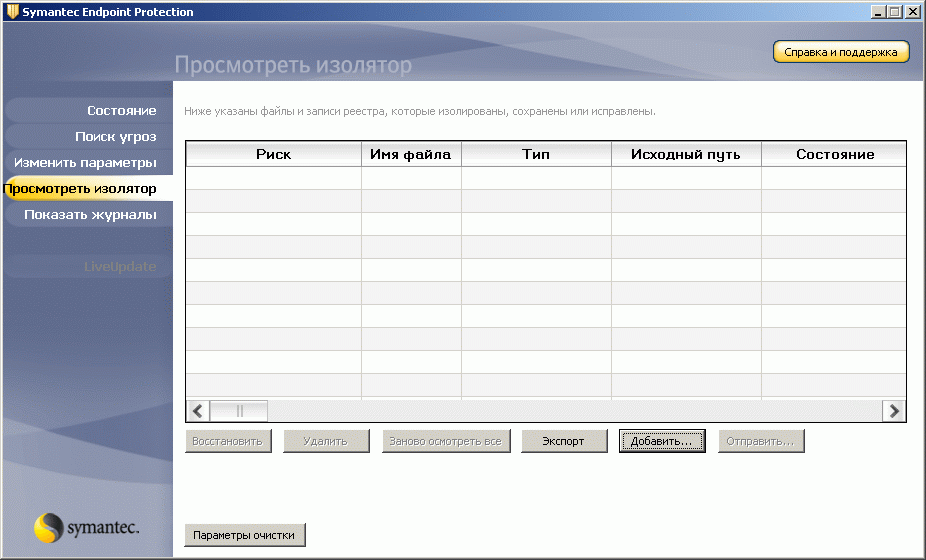Рисунок 1.7: Endpoint Protection Client – View quarantine – Просмотр пользовательского карантина, с возможностью Добавления, Восстановления, а также автоматизированной передачи образцов в Symantec Security Response
