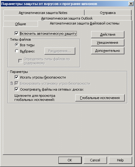 Рисунок 1.9c: Endpoint Protection Client – Antivirus and Antispyware Protection – Auto-Protect Advanced Options – Расширенные настройки сканирования в Реальном времени (продублированы на стороне управляющего сервера)