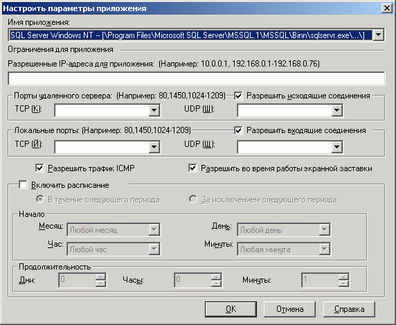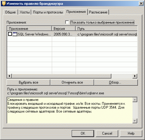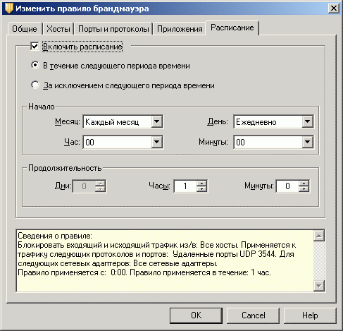 Рисунок 1.13d: Endpoint Protection Client – Network Threat Protection – Configure Firewall Rules – Edit Firewall Rule – Настройки доступа для приложений и графика применения правил