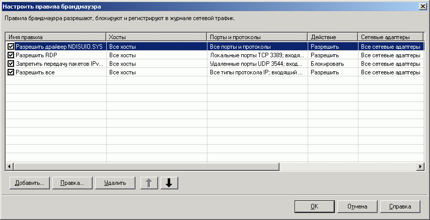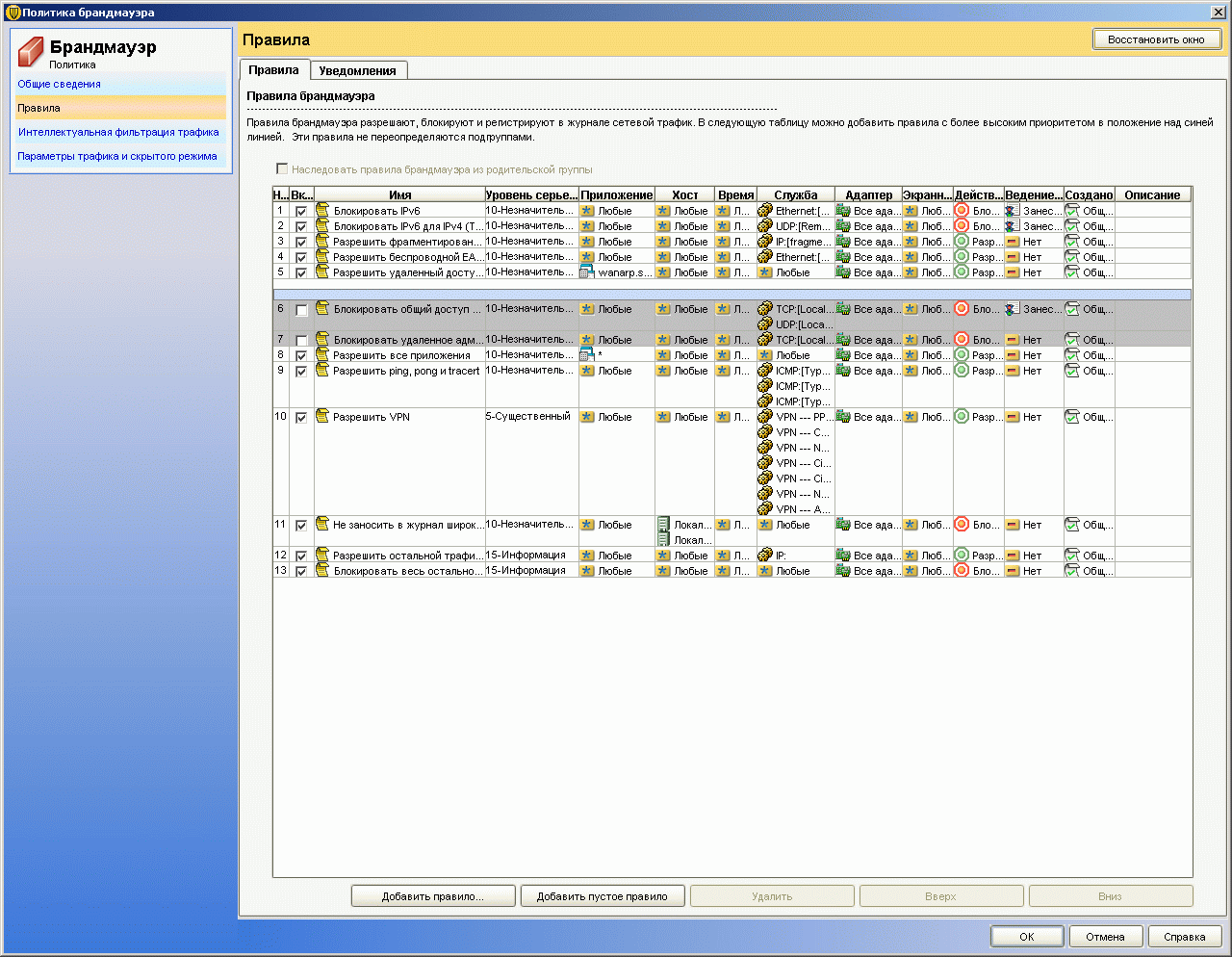 Рисунок 1.13a: Endpoint Protection Client – Network Threat Protection – Configure Firewall Rules – Основная панель настройки правил сетевого доступа для приложений и служб; новая технология, интегрированная в продукт (продублированы на стороне управляющего сервера)