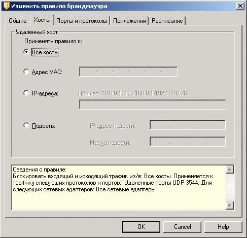 Рисунок 1.13b: Endpoint Protection Client – Network Threat Protection – Configure Firewall Rules – Edit Firewall Rule – Базовые настройки и настройки хостов