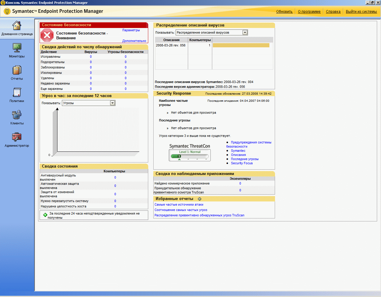 Рисунок 2.4: Endpoint Protection Manager Console – Home Screen – Панель со сводной информацией о состоянии защиты с доступом к основным данным, выбранным отчетам и ресурсам Symantec по безопасности