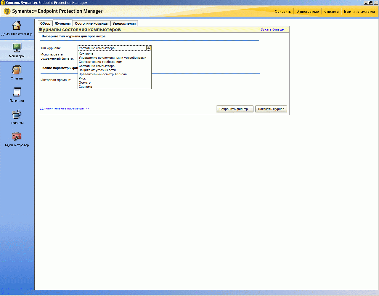 Рисунок 2.5b: Endpoint Protection Manager Console – Monitors Screen – Logs – Панель доступа к развернутой информации по функционированию системы управления и клиентских приложений