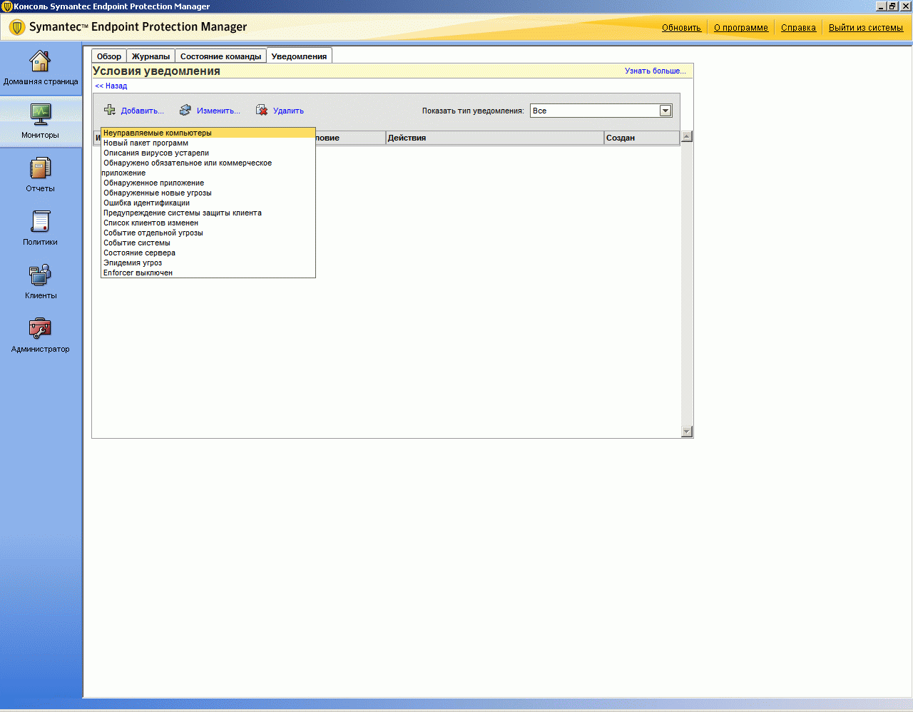 Рисунок 2.5d: Endpoint Protection Manager Console – Monitors Screen – Notifications – Панель доступа к информации о состоянии системы извещений, а также добавления и настройки различных уведомлений и предупреждений системы