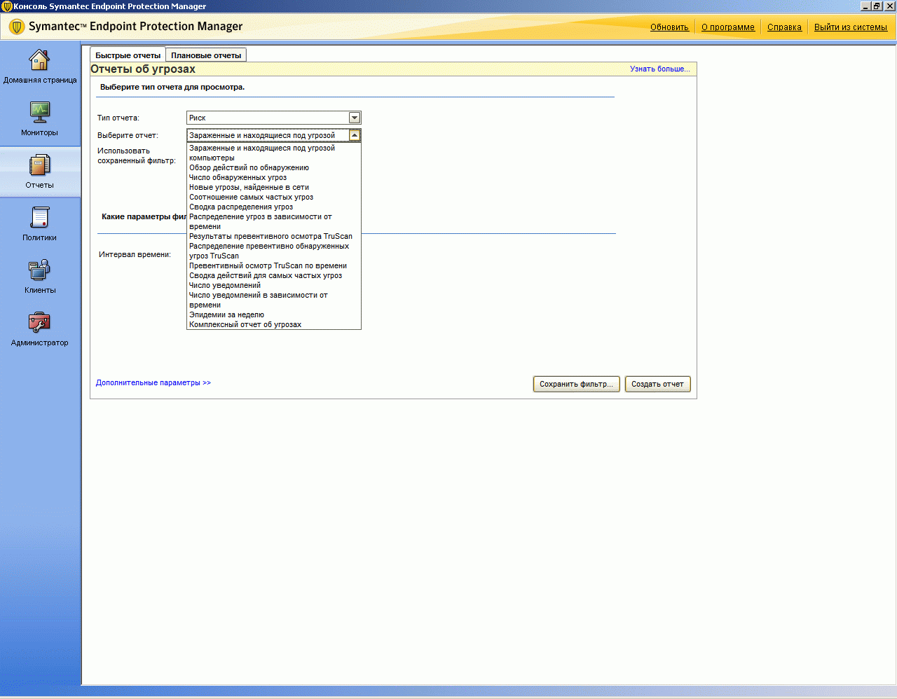 Рисунок 2.6: Endpoint Protection Manager Console – Reports – Панель доступа к системе отчетности, которая позволяет настраивать расписание и предоставлять по запросу около 50 отчетов по работе продукта