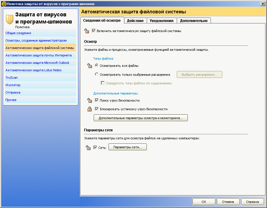 Рисунок 2.8b: Endpoint Protection Manager Console – Policies – Antivirus and Antispyware Policy – Настройки политик частично дублируют соответствующие элементы настроек клиентского приложения, на рисунке приведен пример одного из них. “Замок” позволяет разрешать или запрещать данную настройку клиентам, относящимся к данной политике