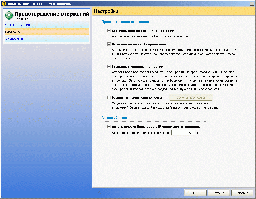 Рисунок 2.10: Endpoint Protection Manager Console – Policies – Intrusion Prevention (IPS) Policy – Настройки политик противодействия атак и анализа трафика дублируют соответствующие элементы настроек клиентского приложения. В зависимости от настроек пользователю либо разрешено, либо нет менять данные настройки в целом в клиентском интерфейсе