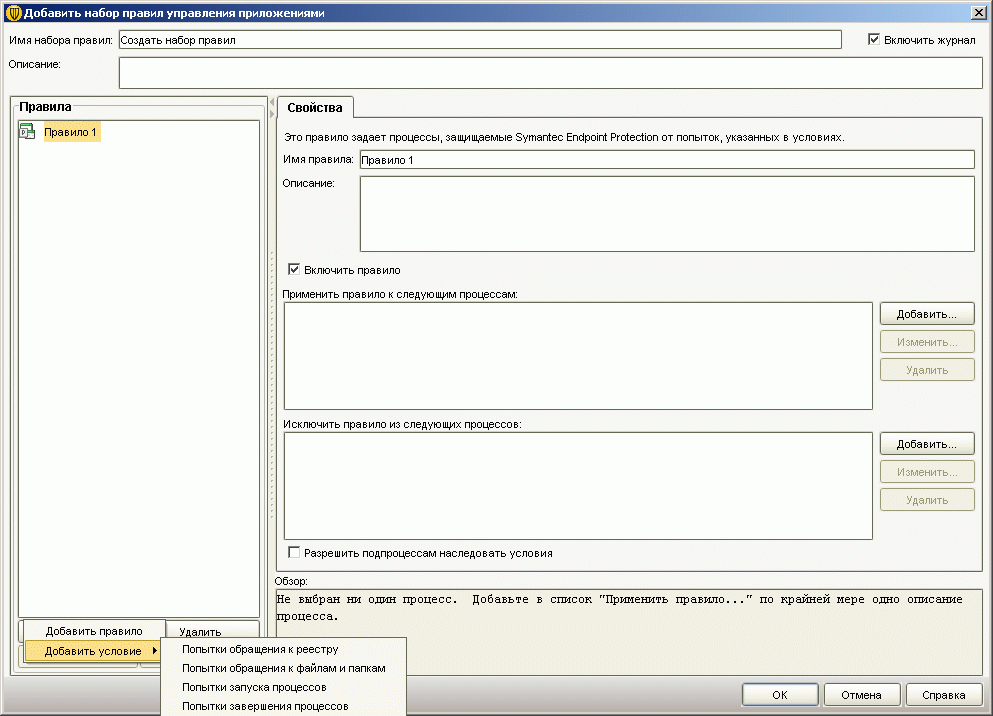 Рисунок 2.12b: Endpoint Protection Manager Console – Policies – Application and Device Control – Application Control – Создание и редактирование правила контроля приложений: возможность контроля доступа к реестру, файлам и папкам, запуску процессов, а также к возможным попыткам остановки приложений