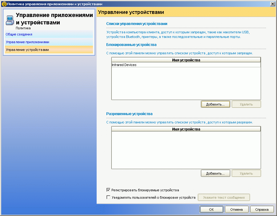 Рисунок 2.13a: Endpoint Protection Manager Console – Policies – Application and Device Control – Device Control – Существуют два варианта блокирования устройств: только определенные, либо все кроме определенных; блокировка возможна при выборе заранее предопределенных классов устройств, которые возможно самостоятельно расширять