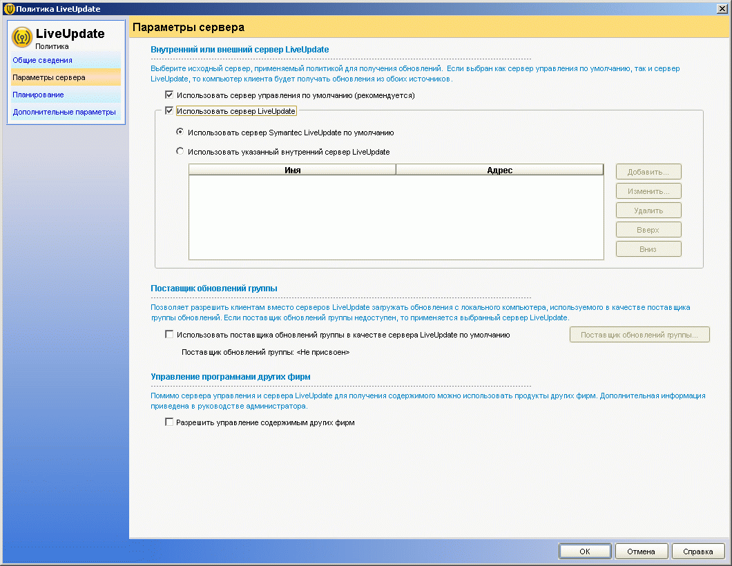 Рисунок 2.14a: Endpoint Protection Manager Console – Policies – LiveUpdate Policy – Панель сводных настроек политики обновления для клиентов, позволяющая запрещать или разрешать обновление через Интернет, создавать альтернативные источники обновлений, регламентировать расписание для обновлений, а также создавать группы компьютеров, обновляющихся с одного из членов группы