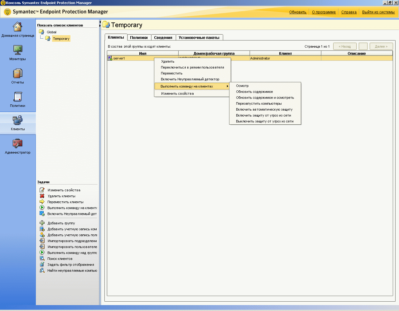 Рисунок 2.17: Endpoint Protection Manager Console – Clients – Clients – Данный раздел консоли управления позволяет производить все операции, связанные с управлением и контролем за клиентскими модулями, включая установку, удаление и настройку