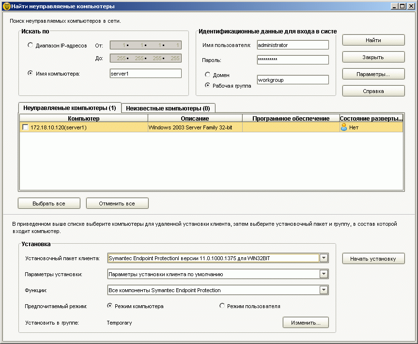 Рисунок 2.18: Endpoint Protection Manager Console – Clients – Clients – Find Unmanaged Computers – Представленное диалоговое окно позволяет производить поиск клиентских компьютеров с отсутствующей защитой или с не подключенной к серверу, с возможностью автоматической установки любого из имеющихся пакетов, поиск может производиться как по диапазону IP-адресов, так и по именам хостов
