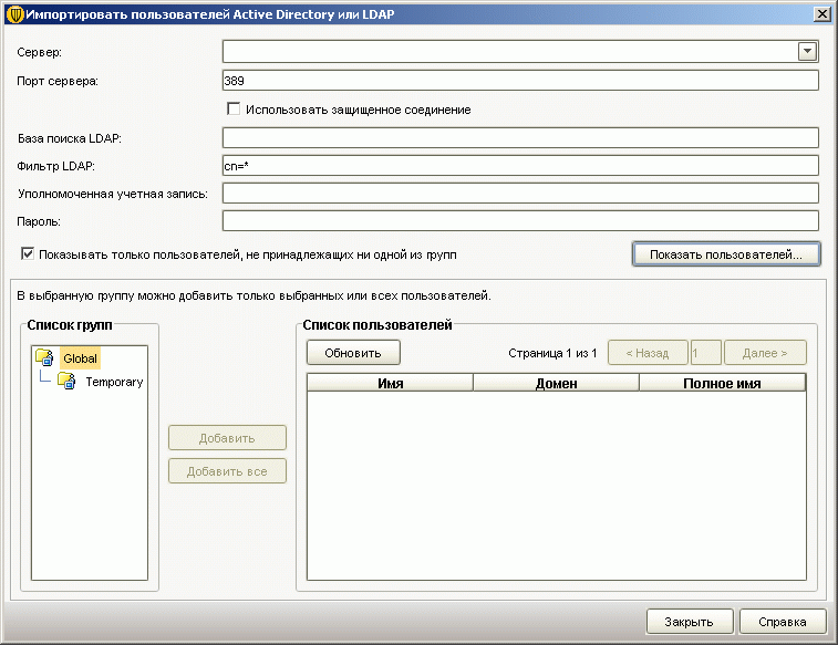 Рисунок 2.19: Endpoint Protection Manager Console – Clients – Clients – Import Active Directory or LDAP Users – Распространение клиентских модулей можно делать как на основе сетевой информации (см. Рисунок 2.18), так и на базе информации Глобального каталога, в случае его наличия